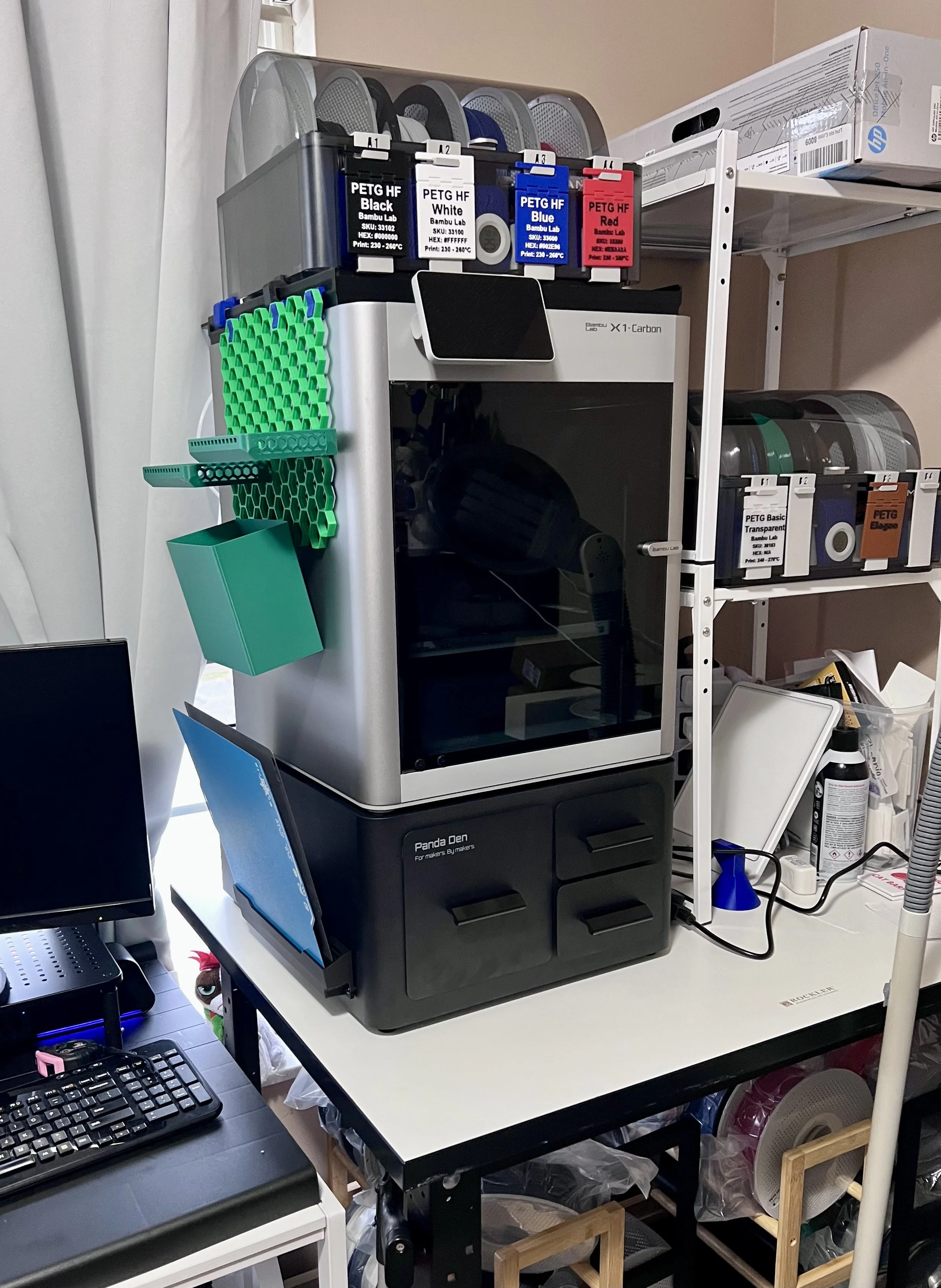 While they were processing, and before, in between, and after, I went to the 3D printer room and finally “installed” the Panda Den under the X1C printer. The Den weighs about 30-35 pounds, because it is a solid steel. And the X1C weighs a little more. That would not be too much to lift, but it has no handles. I have to wrap arms around it and lift without it slipping.