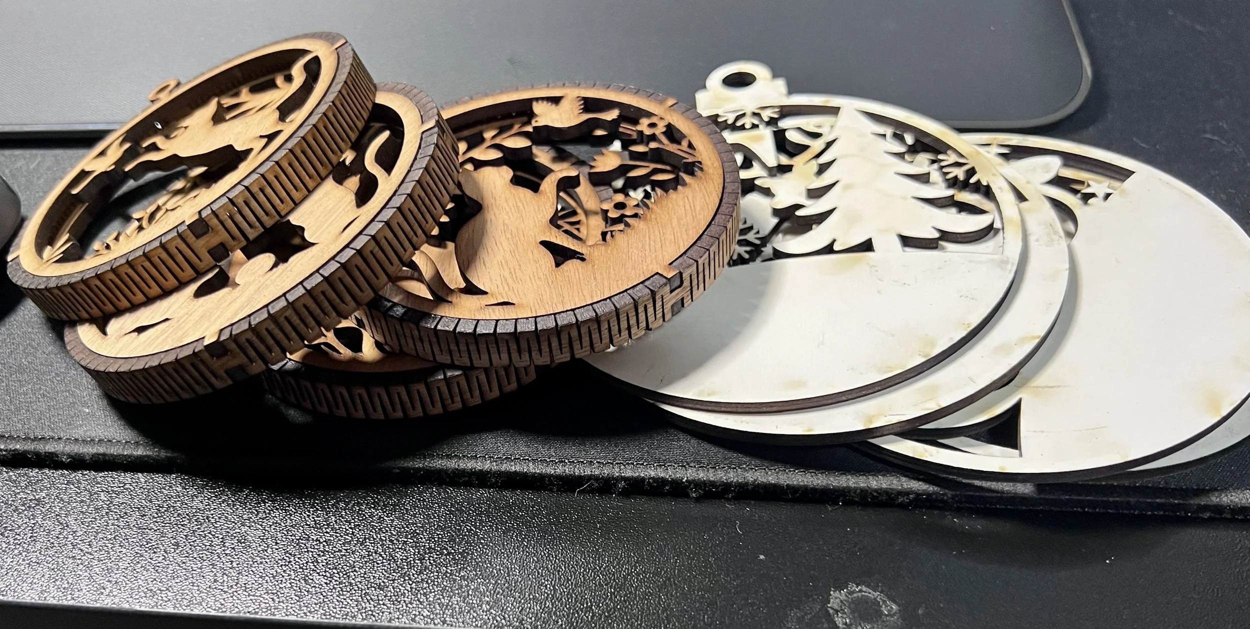 Made some ornaments to start. They do need to have the “burn” dirt wiped off. They look better in person.