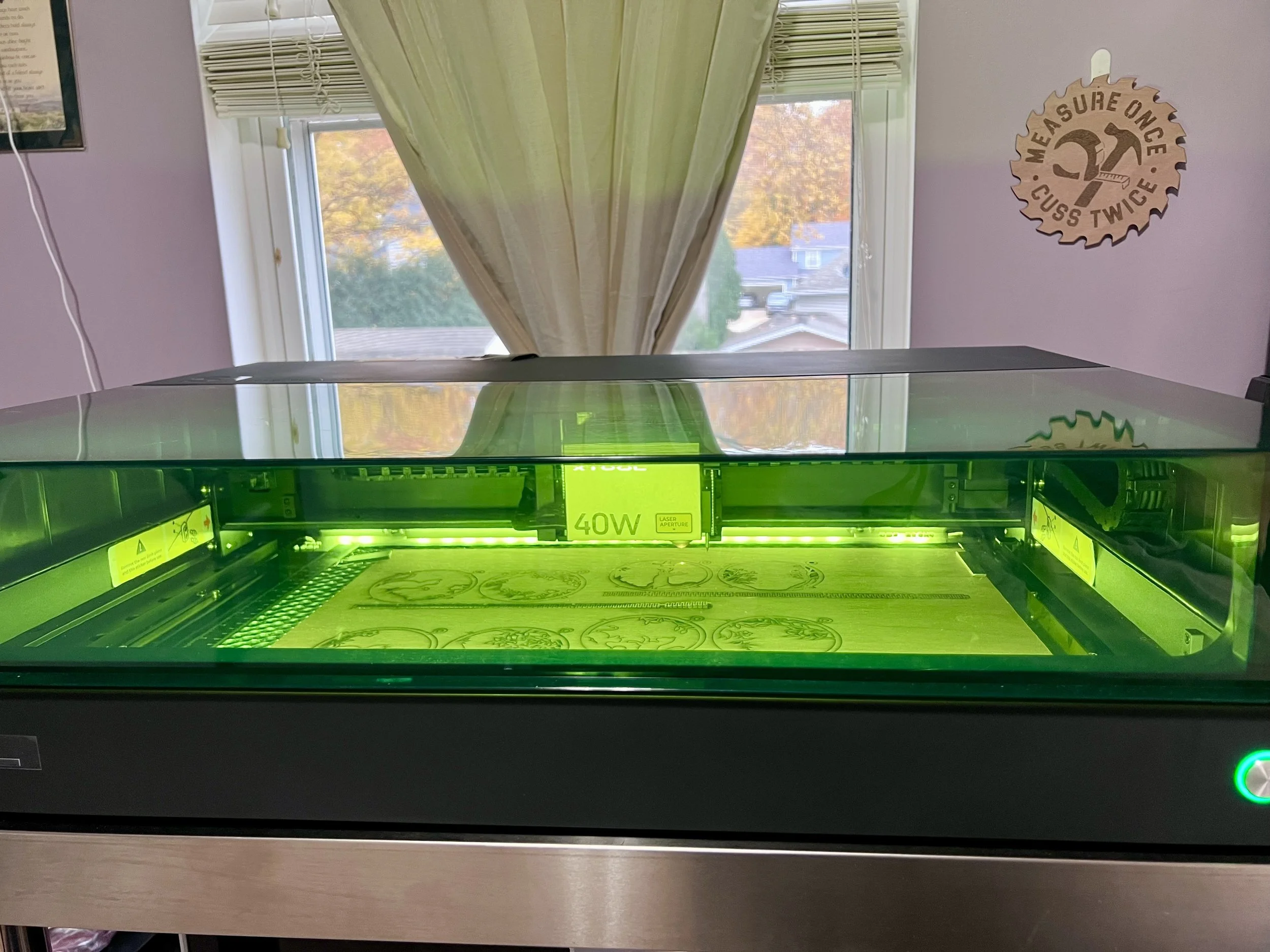 I got my backside upstairs and started up the Xtool S1 40watt Diode laser. And, as one should expect, it needed more updates to the firmware, and then to the software. And then, the PC (laptop) decided it HAD to have an update too. Then, the Xtool software said I should update to their new software. I said no, and then couldn’t connect to the laser. So, I am now using Xtool’s new “Studio” software application. That did connect to the laser.